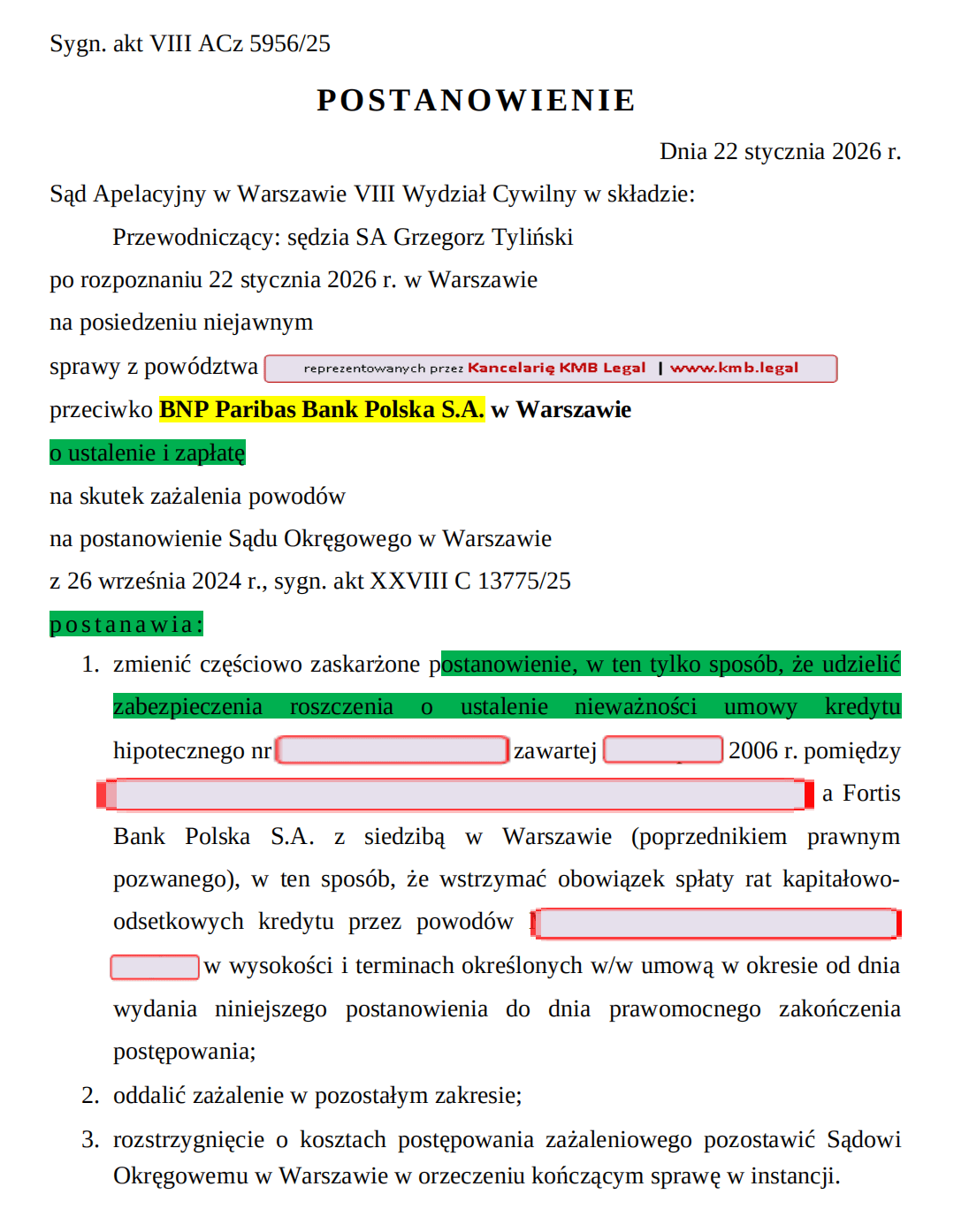 Uzyskaliśmy kolejne bowiem wstrzymanie płatności rat dla Frankowiczów. Kancelaria KMB Legal po raz kolejny skutecznie pomaga konsumentom w walce z nieuczciwymi umowami proponowanymi przez Banki. W ostatniej sprawie, nasz klient posiadający kredyt w BNP Paribas (ex-Fortis Bank), na mocy orzeczenia Sądu Apelacyjnego w Warszawie całkowicie przestali bowiem spłacać swoje zobowiązanie kredytowe. Od dnia 22 stycznia 2026 roku nie muszą już bowiem regulować rat kredytu Frankowego.