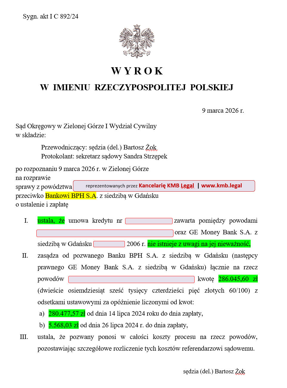 9 marca 2026 roku stał się kolejnym szczęśliwym dniem dla klientów Kancelarii KMB Legal. Tego dnia Sąd Okręgowy wydał bowiem korzystny wyrok dla Kredytobiorców. Całkowicie unieważnił umowę kredytu. Dodatkowo Bank jest zobowiązany zwrócić naszym Klientom 286 tys. PLN.