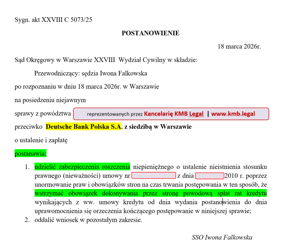Sąd Okręgowy w Warszawie dnia 18 marca 2026 roku przychylił się do wniosku Kancelarii KMB Legal i udzielił naszym Klientom zabezpieczenia roszczenia. Oznacza to, iż Eurowicze na czas trwania procesu o unieważnienie umowy kredytu z Deutsche Bank nie muszą spłacać dalszych rat kredytu w euro. Dzięki zaufaniu naszej Kancelarii i doświadczonym prawnikom, Eurowicze i Frankowicze mogą bowiem odetchnąć z ulgą podczas procesów o unieważnienie kredytu i oczekiwać na kolejne rozstrzygnięcia w sprawie.