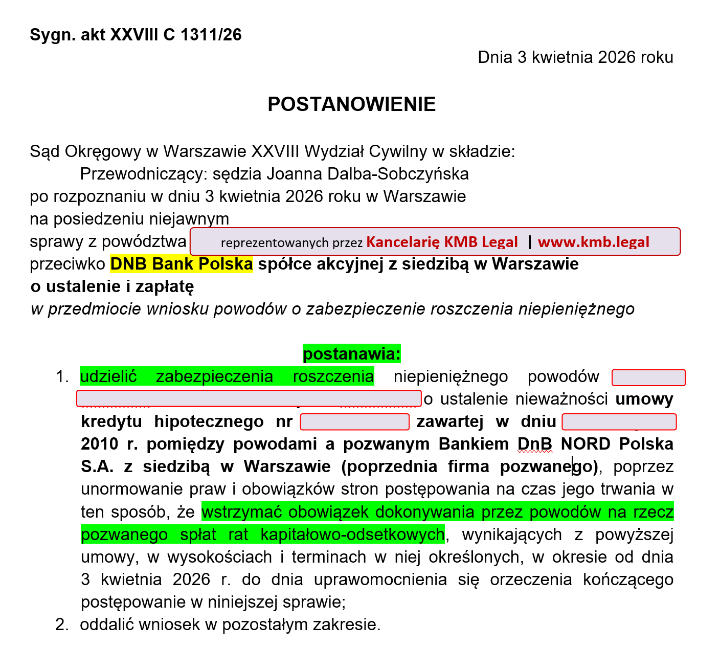 Kancelaria KMB Legal uzyskała uzyskuje bowiem kolejne korzystne orzeczenie dla Eurowiczów DNB Bank Polska. Sąd Okręgowy w Warszawie dnia 3 kwietnia 2026 roku postanowił bowiem udzielić zabezpieczenia roszczenia naszym klientom. W rezultacie na mocy tego orzeczenia Kredytobiorcy nie zapłacą już żadnej raty kredytu do czasu prawomocnego zakończenia się sprawy. Teraz nie muszą już śledzić kursu i martwić się spłacaniem rat.