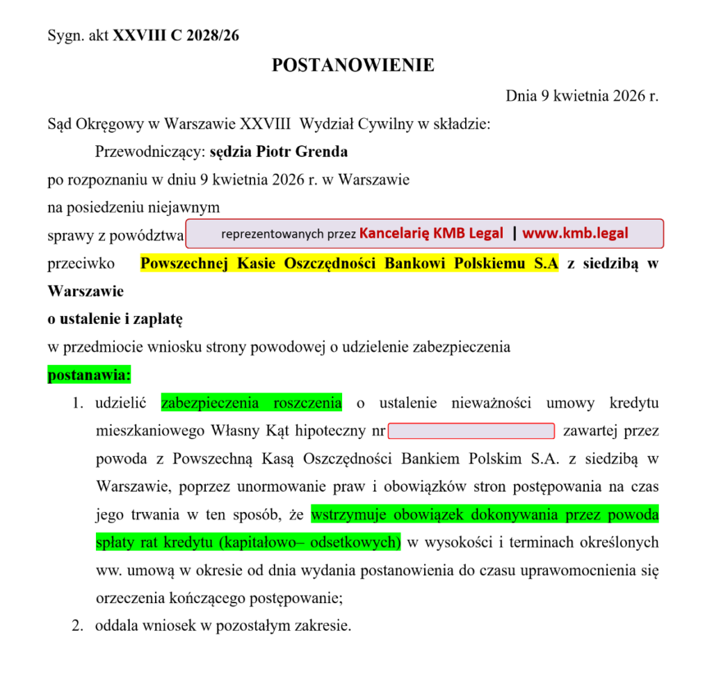 Sąd Okręgowy w Warszawie dnia 9 kwietnia 2026 roku przychylił się do wniosku Kancelarii KMB Legal i udzielił naszym Klientom zabezpieczenia roszczenia. Oznacza to, że Frankowicze na czas trwania procesu o unieważnienie umowy kredytu z PKO BP nie muszą spłacać dalszych rat kredytu CHF. Zdecydowanie warto zaznaczyć, że dobrymi informacjami mogliśmy się już podzielić po miesiącu od czasu wniesienia pozwu. Dzięki zaufaniu naszej Kancelarii i doświadczonym prawnikom, Eurowicze i Frankowicze mogą bowiem odetchnąć z ulgą podczas procesów o unieważnienie kredytu i oczekiwać na kolejne rozstrzygnięcia w sprawie.